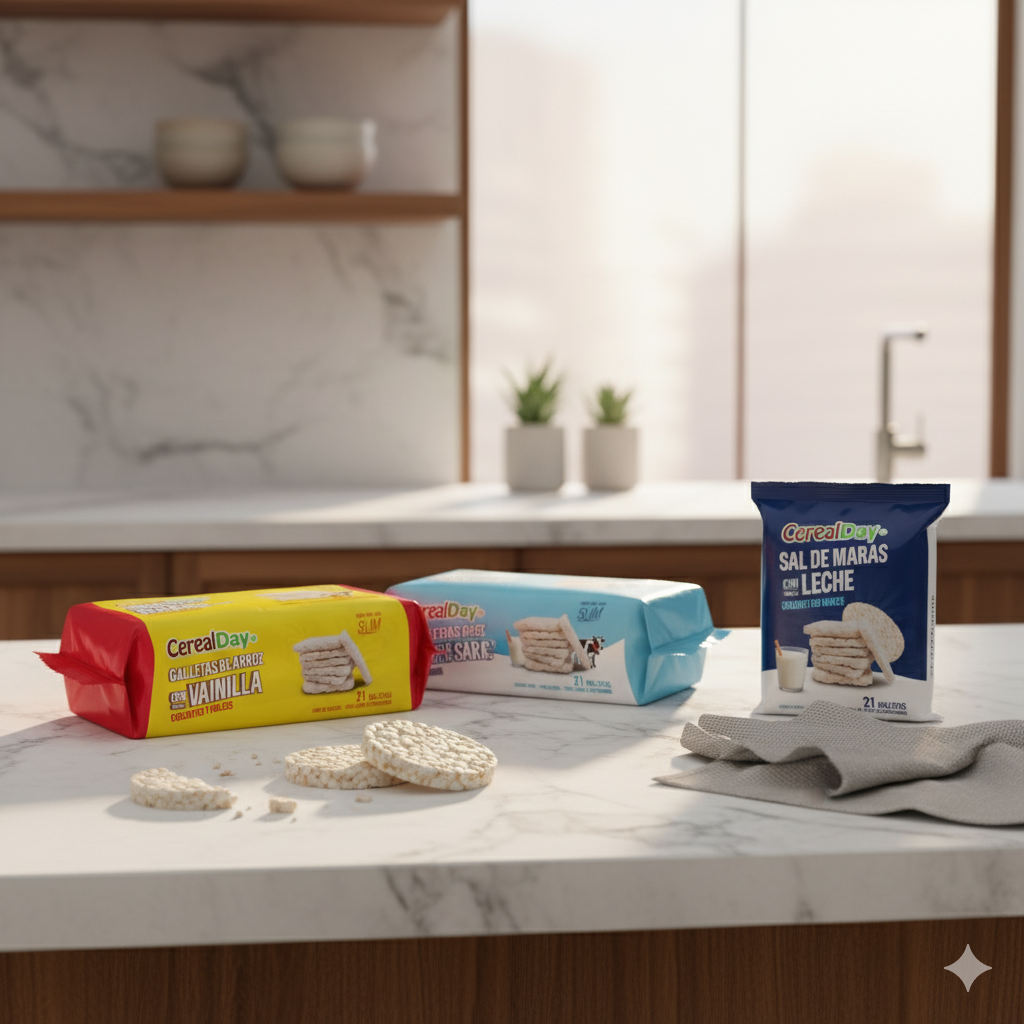 Galletas de arroz sin octógonos, disponibles en versiones dulces y saladas. Son una opción ideal para acompañar dips, untables o snacks funcionales a lo largo del día.